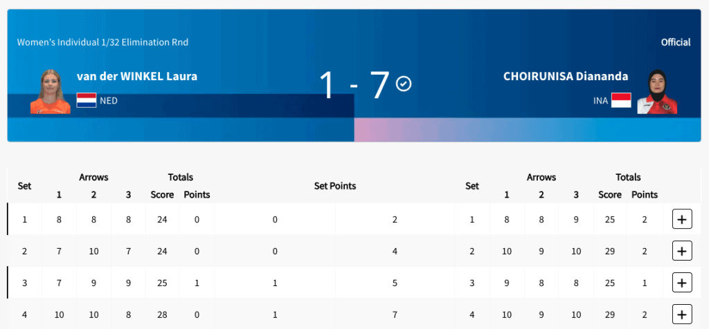 Daar waar Laura van der Winkel en Diananda Choirunsia uit Indonesië gelijk op gingen met tweemaal een acht in de eerste set van de 1/32e finale, nam de Indonesische tegenstander de constante overhand. Laura kon in de tweede set de eerste pijl nog maar net vasthouden, wat resulteerde in een zeven en daarmee vier setpunten achterstand. De derde werd gedeeld na een 25-25 gelijke stand, maar daar waar Laura sterk begon aan de vierde set was het toch niet genoeg. De Indonesische won met 29 punten tegen de 28 punten van Laura, en daarmee de match met 7-1. Hiermee eindigt het Olympische toernooi voor Laura na de eliminatieronde vandaag en fantastische prestatie eerder met het damesteam.
