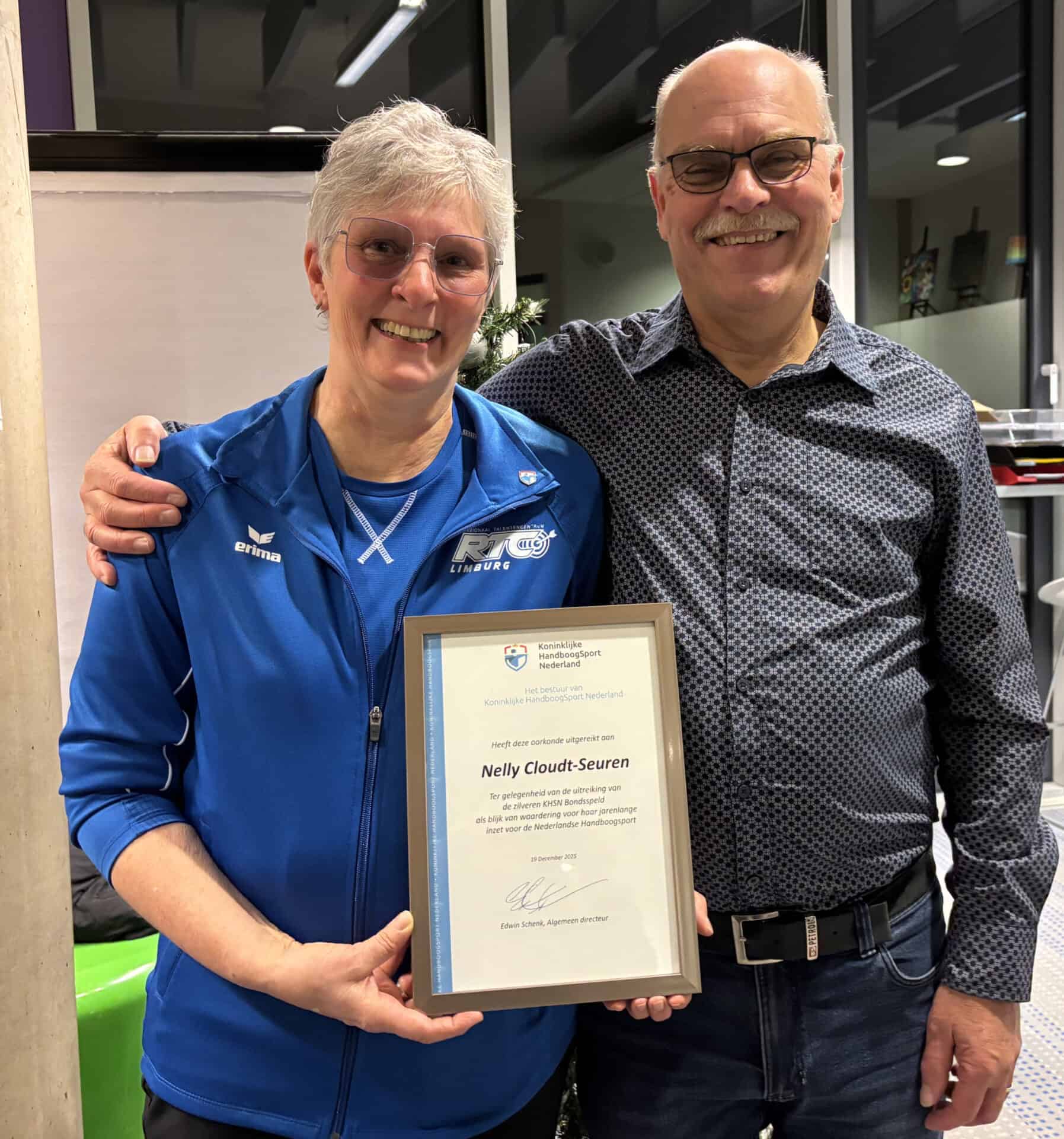 Op vrijdag 19 december heeft Nelly Cloudt de zilveren Bondsspeld in ontvangst mogen nemen. Deze onderscheiding ontving ze – uit handen van Marc Steinmetz – als blijk van waardering voor haar jarenlange inzet voor de handboogsport in het algemeen en specifiek voor haar rol binnen het RTC Noord-Limburg.